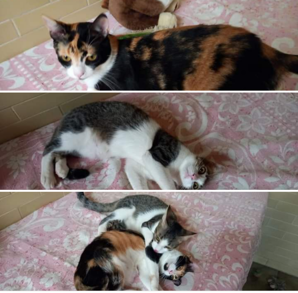 Os irmãos CACAU (fêmea tricolor) e ZYAN (manto cinza) foram resgatados bebês e estão em Lar Temporário.